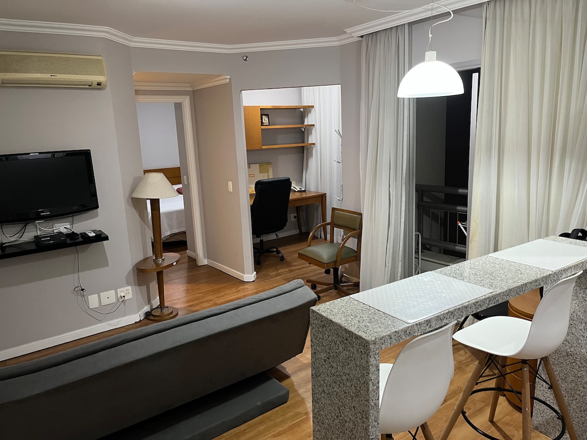 Cama tamaño queen, aire acondicionado, TV inteligente de 43pulgadas, Internet de fibra, 1 estacionamiento, gimnasio y piscina. Pertinho da Avenida Paulista y con fácil acceso al metro. ¡Horarios de entrada y salida flexibles! Consulta la disponibilidad. :) Ideal para la oficina en casa: dos redes de Internet independientes, Vivo y Claro, ambas con 300 Mb. Limpieza diaria y limpieza del departamento. Las estancias largas (más de 10 días) incluyen un cambio de ropa de cama y baño.
