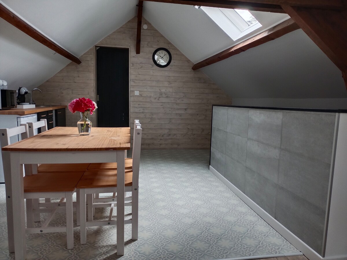 Apartamento independiente sobre nuestro garaje accesible por una escalera. Moderno y cómodo en un entorno agradable y tranquilo en el campo. Todos los comercios a 5 minutos en coche. Adecuado para cualquier viajero (individual, pareja, amigos, compañeros, familia, animales). En un jardín cerrado donde tiene la opción de aparcar varios vehículos. Consta de una cocina abierta al salón, un aseo independiente, un dormitorio y un baño. Acceso al jardín con mesa, silla, barbacoa y juegos para niños.