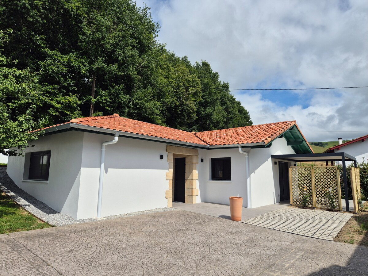 Encantador alojamiento rodeado de jardín y bosque verde. Los espacios son amplios y acogedores. La cocina es tipo americana y está muy equipada. El baño un placer con vistas también al bosque. Si venís con vuestra mascota, será feliz. Tenemos una preciosa beagle. Estamos a 2km de la frontera, a 10min de la playa , a 20min de San Sebastian y de Biarritz. Quieres pasear por monte? la ruta GR-10 comienza aquí mismo. El pueblo os encantará, es precioso con su frontón, su iglesia, su restaurante.