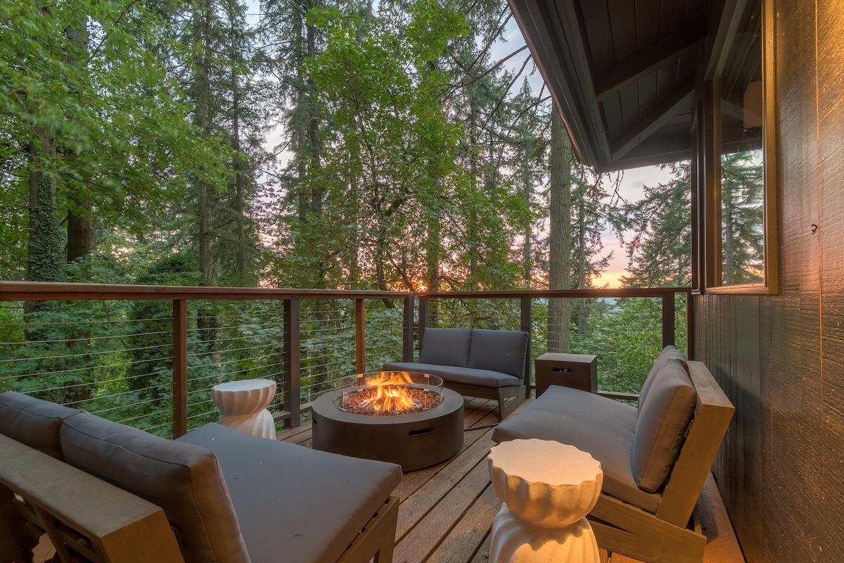 Serenidad, privacidad y comodidad en el exclusivo Eugene South Hills. Ubicada en las copas de los árboles, pero a minutos de la U de Oregón/centro de la ciudad/I-5, esta suite de huéspedes dedicada de más de 900 pies cuadrados de 3 niveles tiene una entrada privada, paredes de ventanas, una chimenea de leña, una bañera de hidromasaje al aire libre, una cama king size, wi-fi, cable/Netflix, auto check-in/check-out, entrada sin llave, nuevo HVAC sin ductos y un masajista disponible. Este es el Airbnb #1 en Eugene utilizado para lunas de miel, escapadas y un video musical.