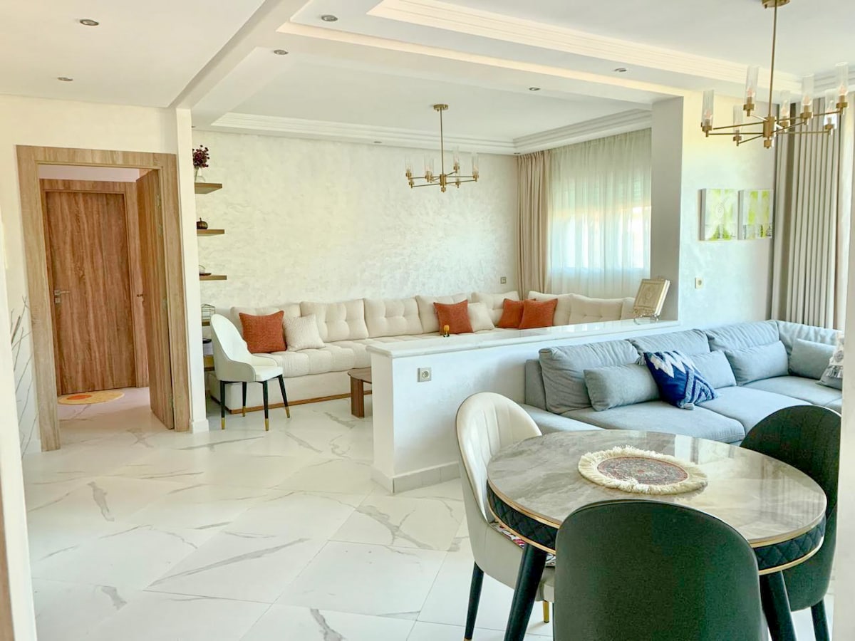 Amplio apartamento de 3 dormitorios con jacuzzi y un gran salón privado con aire acondicionado en la terraza cubierta. Disfrute de un momento de descanso en total intimidad. A solo 7 minutos de Malabata en coche cerca de la playa, la estación de tren TGV, restaurantes y centro comercial. Perfecto para familias o grupos: Wi-Fi de fibra, Netflix, cocina equipada, 3 cómodas habitaciones y todo lo necesario para sentirse como en casa en Tánger.