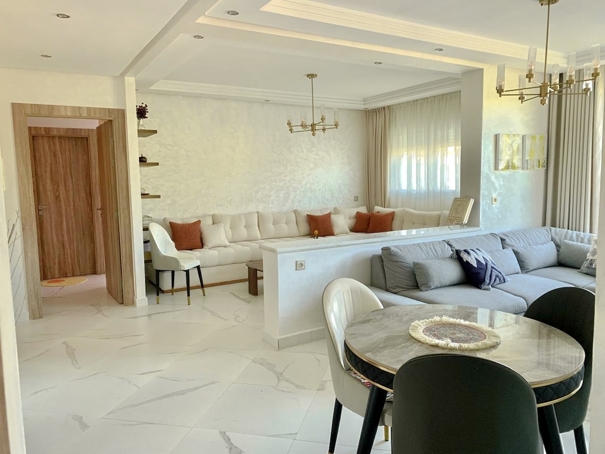 Spacieux appartement 3 chambres avec jacuzzi et un grand salon climatisé privé sur terrasse couverte. Profitez d’un moment de détente en toute intimité. À seulement 7 min de Malabata en voiture proche plage, gare TGV, restaurants et mall. Parfait pour familles ou groupes : Wi-Fi fibre, Netflix, cuisine équipée, 3 chambres confortables et tout le nécessaire pour se sentir chez soi à Tanger.