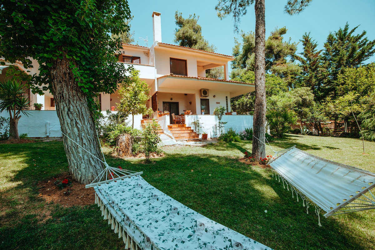Casa de vacaciones de dos dormitorios en el bosque de pinos de Sani. Ambas habitaciones tienen aire acondicionado y ventiladores de techo, hay un acogedor salón con TV de pantalla plana y cocina totalmente equipada, y una amplia terraza con vistas al bosque y al jardín. La playa más cercana es ideal para familias y se puede acceder a pie o en coche (750 m), mientras que las tiendas y restaurantes están a menos de 10 minutos en auto. Estacionamiento gratuito disponible.