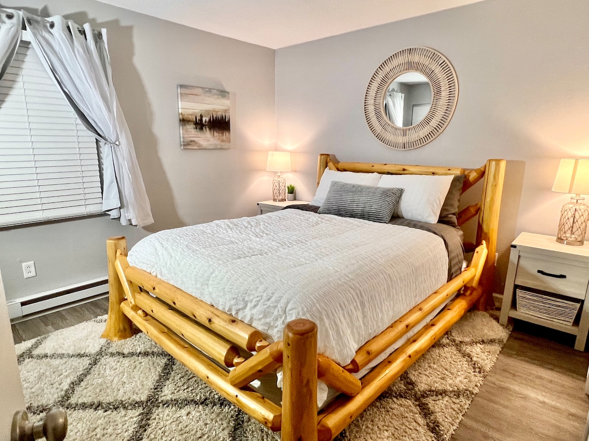 Este encantador alojamiento de 2 dormitorios y 2 baños totalmente rehabilitado es la mejor alternativa a un hotel/motel en esta zona. 1100 pies cuadrados de comodidad en el nivel principal y dormitorio en altillo, diseñado con una vida fácil y cómoda en mente. La cocina funcional ofrece aperitivos y un espacio abierto al acogedor salón/comedor. La sala de estar tiene un cómodo sofá, un rincón de lectura (cama supletoria para un niño), TV lista para transmitir todos tus favoritos y wifi. El segundo dormitorio también tiene TV.