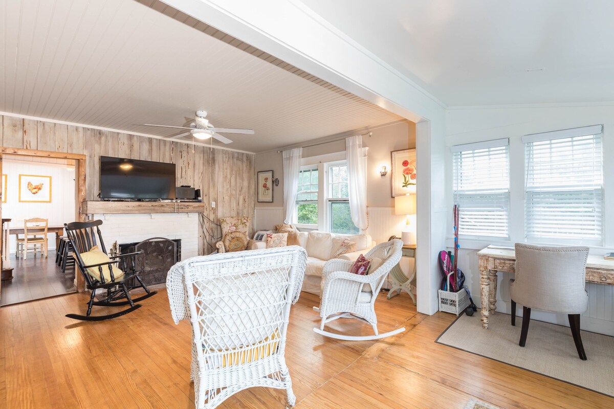 Casa de campo de 4 dormitorios y 2 baños, completa con ducha exterior. Encantador espacio al aire libre adornado con luces del mercado, envuelve el sofá al aire libre, el hoyo de maíz, la parrilla y la música en todas partes (Sonos). Perfectamente enclavado entre la vida del pueblo y el océano (4 minutos a pie en cualquier dirección). Entra a una cocina completa con chef. Aire acondicionado en todas las habitaciones. WIFI FIOS DE ALTA VELOCIDAD. Nuestra colección seleccionada de libros y DVD. Juguetes de playa, tumbonas, tabla de boogie. ¡Solo trae un cepillo de dientes! Anuncio *NO* en Craigslst.