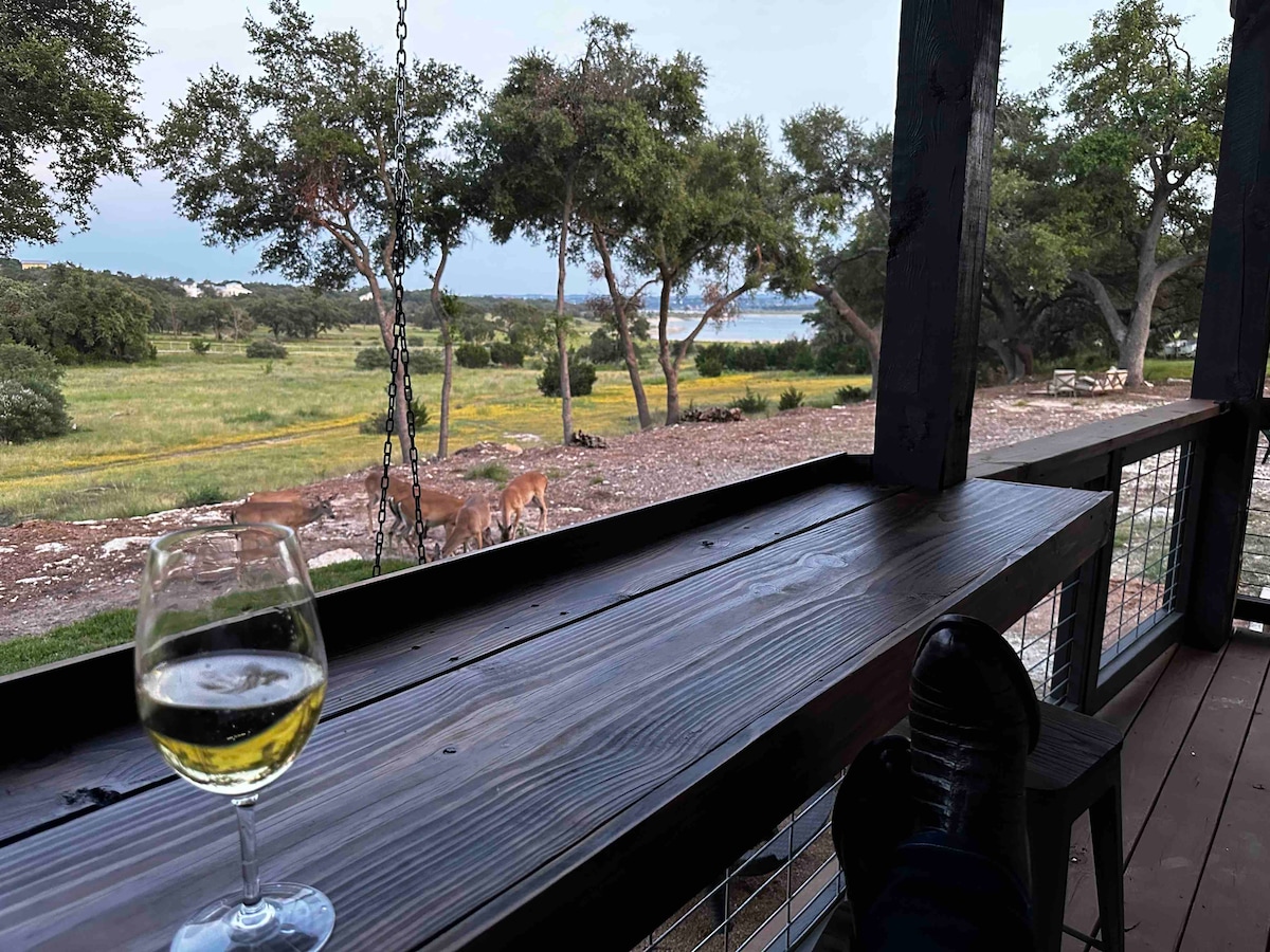Welcome to The Overlook Tower! This 2-bedroom, 1-bathroom home is perfect for couples, small families, and lake lovers seeking a tranquil getaway. Amenities include a 5-person hot tub, large patio with lounge chairs/chaises, panoramic views of the Texas Hill Country, RV hookup/Tesla charger, 2 Smart TVs, 2 couches, a dining table, and a fully stocked kitchen. Each room is equipped to enjoy your trip with comfort! Enjoy your stay!
