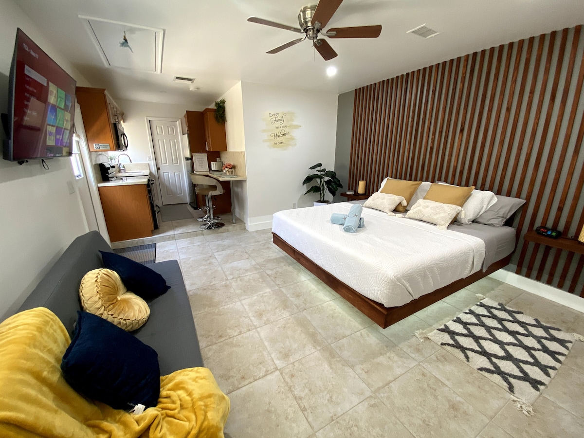 Este es un refugio moderno de mediados de siglo recién reformado en el corazón de Pembroke Pines. Este cómodo estudio es ideal para estancias cortas, con una cocina completa, un baño bellamente actualizado y una amplia sala de estar. Relájate en una cómoda cama tamaño queen y un futón que se abre a una cama doble. Incluye café de cortesía, artículos de aseo, wifi rápido y un televisor inteligente con aplicaciones de streaming. Sumérgete en la comodidad y el estilo en este acogedor espacio en la vibrante Pembroke Pines.