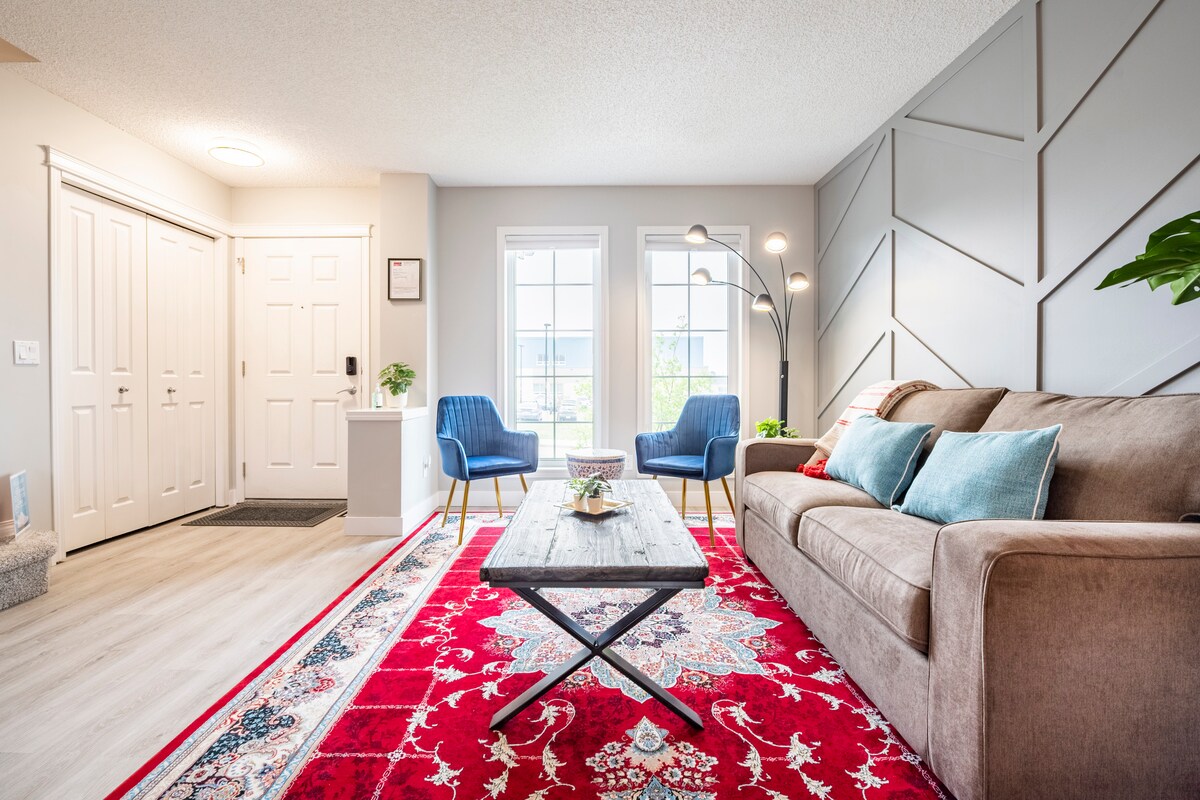 Disfruta de una acogedora estancia con AIRE ACONDICIONADO en Seton Sunshine, una casa adosada dorada con temática tropical en el sureste de Calgary. Ideal para viajeros solos, parejas o grupos pequeños de hasta 4 personas, la casa adosada cuenta con un dormitorio queen, sala de estar de planta abierta con sofá cama, cocina completa y zona de patio. Otros servicios incluyen televisores, wifi, lavadora/secadora, acceso a los servicios cercanos de Seton, transporte, hospital y YMCA. Ubicado cerca del hospital South Health y es la base perfecta para explorar la ciudad y las montañas.