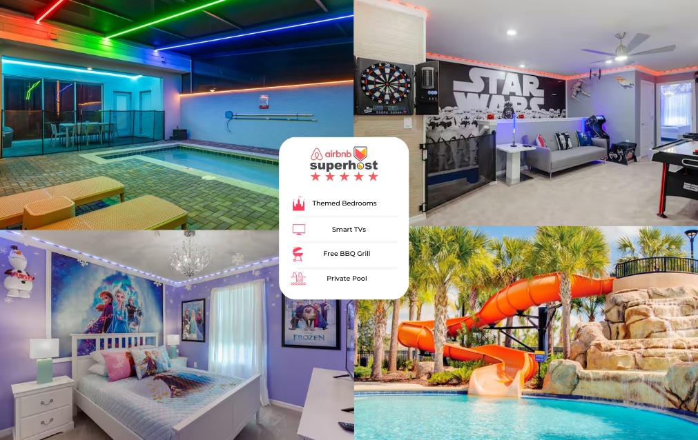 ¡Disfruta de tu escapada de ensueño en esta espaciosa casa de lujo de 6 dormitorios/4,5 baños a pocos minutos de Disney, los mejores restaurantes y tiendas! Relájate en la piscina privada y el jacuzzi, disfruta de las noches de cine en 7 televisores inteligentes y diviértete en la sala de juegos. Hay wifi rápido, barbacoa y opciones que admiten mascotas (se aplican tarifas). Ya sea tiempo en familia o un retiro en grupo, ¡este alojamiento ofrece la combinación perfecta de comodidad, diversión y conveniencia! ¡Reserva tu estadía hoy mismo!