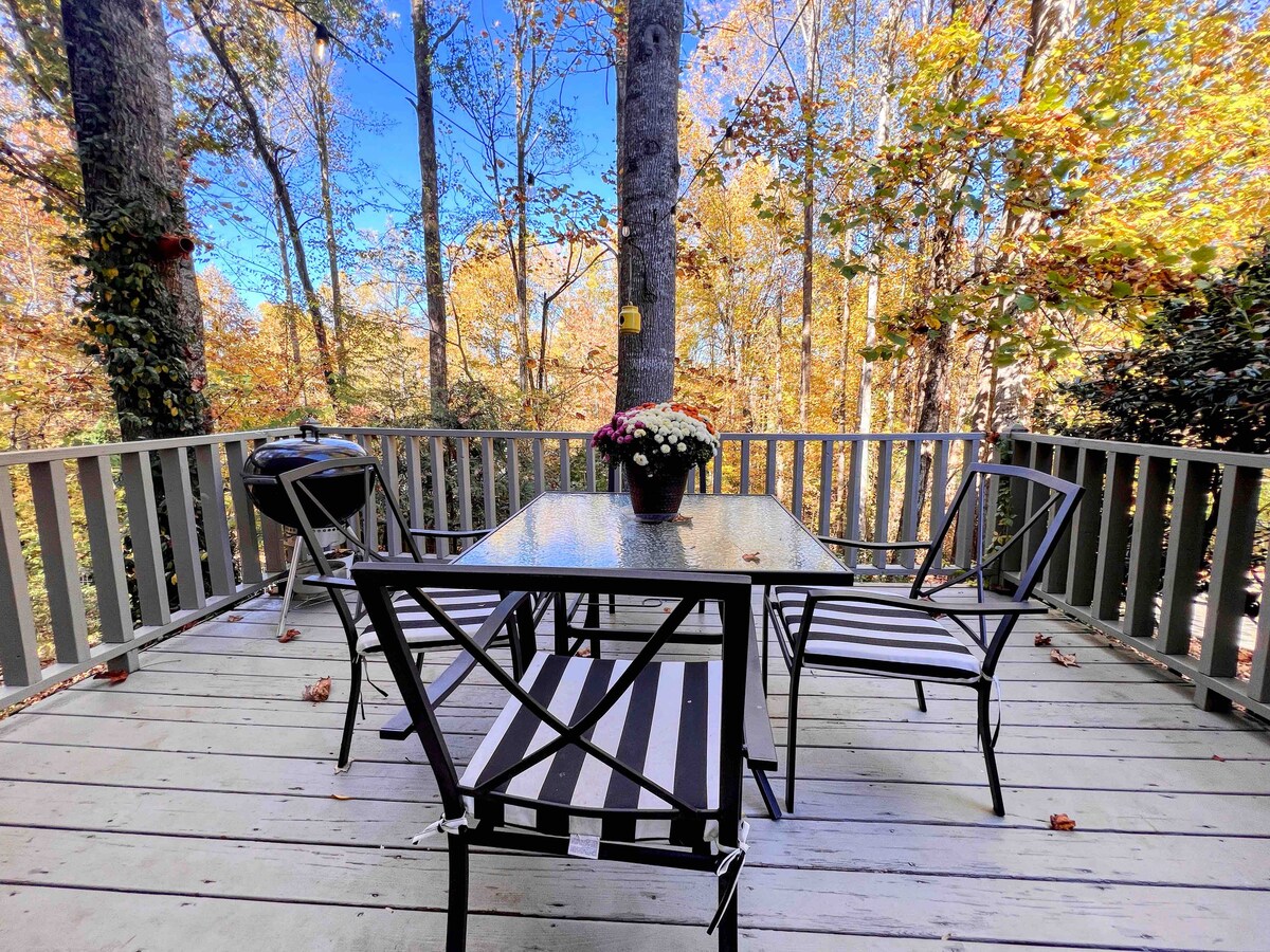 ¡Perfectamente intacto, cero daños después de Helene y con agua de pozo limpia! Carreteras accesibles y espacio bellamente remodelado. Este hogar lejos de casa cuenta con impresionantes vistas a la montaña en un entorno hermoso y familiar con 850 pies cuadrados para relajarse. Relájate en el patio con chimenea al aire libre, donde podrás disfrutar de la belleza de la naturaleza y la vida silvestre local. Este alojamiento limpio y reluciente está a solo 20 minutos del Biltmore y del centro de AVL y a solo 30 minutos del aeropuerto de AVL. Capacidad para 5 personas (o 6, incluido un bebé).