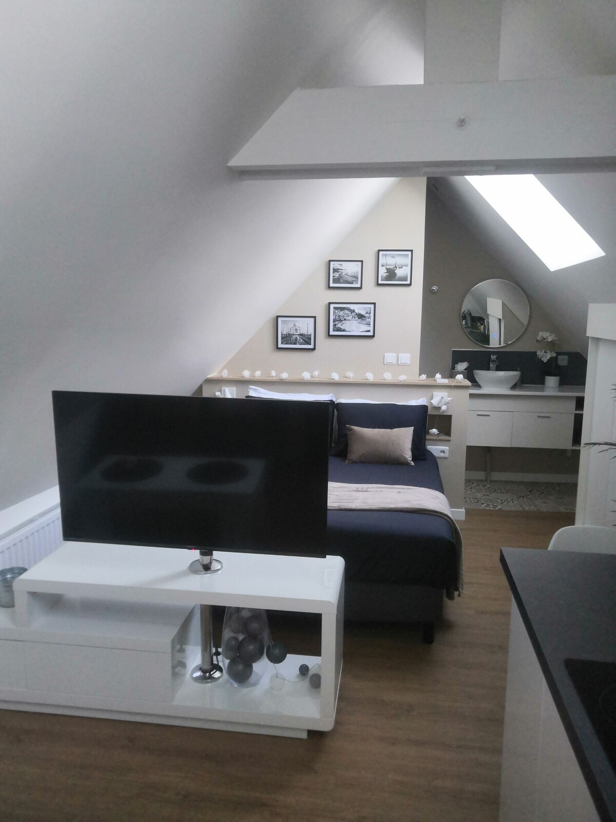 Una noche en el agua, entre Giverny y La Roche Guyon… Situado en el Sena, el Nauti Cottage está amarrado en el puerto deportivo del bonito pueblo de Bennecourt… Un estudio de 20 m², una gran terraza cubierta de 18 m² con vistas panorámicas al río, le darán la sensación de estar en una lujosa cabina de barco. Una parada romántica, una escala para llegar a Giverny (12 minutos en coche, 6 km), a La Roche Guyon (12 minutos también, 7 km), visitar el valle del Sena o el parque natural de Vexin