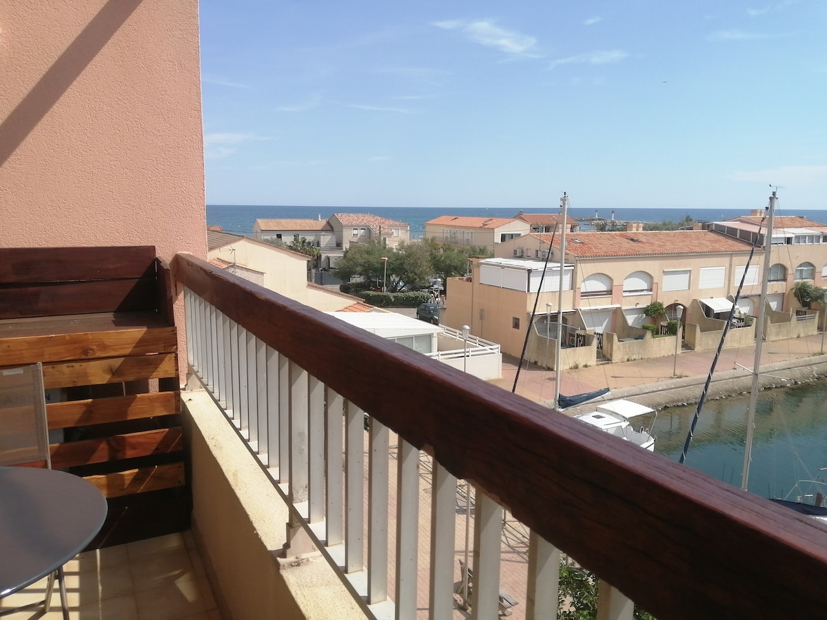 Estudio idealmente situado, frente al mar, en la localidad costera de Palavas-les-Flots, - a 10 minutos en coche del Parque de Exposiciones de Montpellier (Pérols) - a 15 minutos en coche de la salida de la autopista, - a 10 min en coche del aeropuerto El estudio situado en la 2.ª planta del edificio con ascensor está equipado con todas las comodidades necesarias, aire acondicionado reversible, cocina independiente, TV, aparcamiento cerrado gratuito dentro del edificio... y tiene vistas al mar.