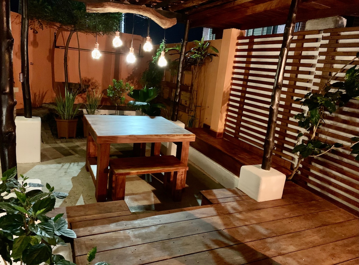 Disfruta de vivir como un habitante más de un habitante más céntrico en esta encantadora casa tradicional de Galápagos con una encantadora terraza de madera, jardín y patio cubierto que ofrece una maravillosa sala de estar al aire libre. La casa ha sido renovada con medios modernos que incluyen aire acondicionado y ducha de agua caliente. Hay pisos de baldosas en todas partes. La casa tiene una cocina y una sala de estar con una gran vista del jardín. Amueblado con muebles personalizados hechos en Galápagos. En el jardín, hay una gran chimenea de barbacoa y un comedor al aire libre
