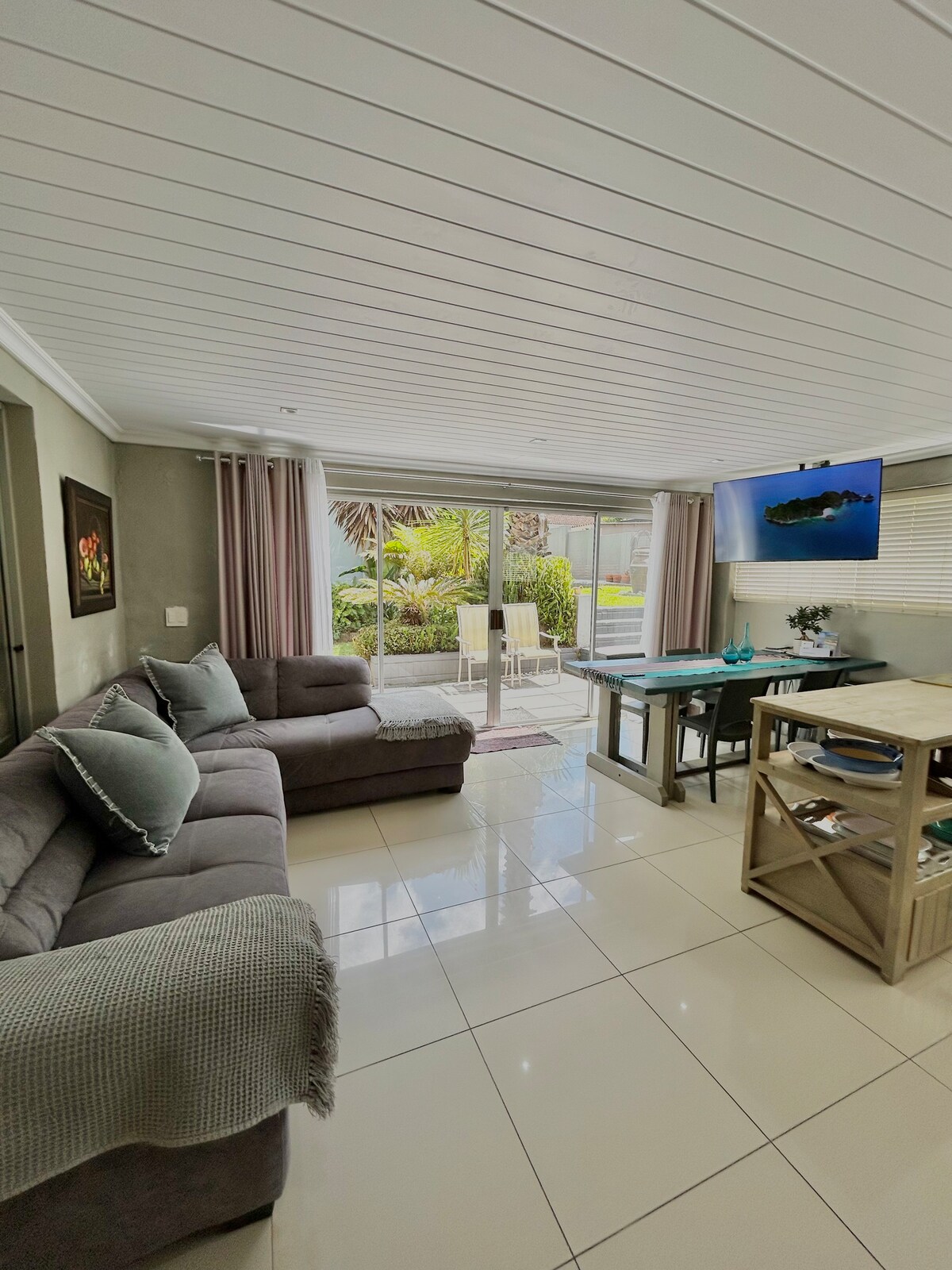Un hermoso piso pequeño privado en la planta baja para dos, con cocina y baño situado en una tranquila calle arbolada de un barrio frondoso bien situado. Compartiendo una propiedad con la casa de estilo georgiano de nuestra familia, el patio tiene vistas a jardines subtropicales, una piscina y una zona braai. Entrada y aparcamiento seguro dentro de la puerta. Si necesitas un espacio más grande (salón, etc.), ¡busca en nuestro piso superior! El aeropuerto, los servicios de la ciudad, los parques, los campos de golf y los bosques están todos cerca también de la carretera de las playas.