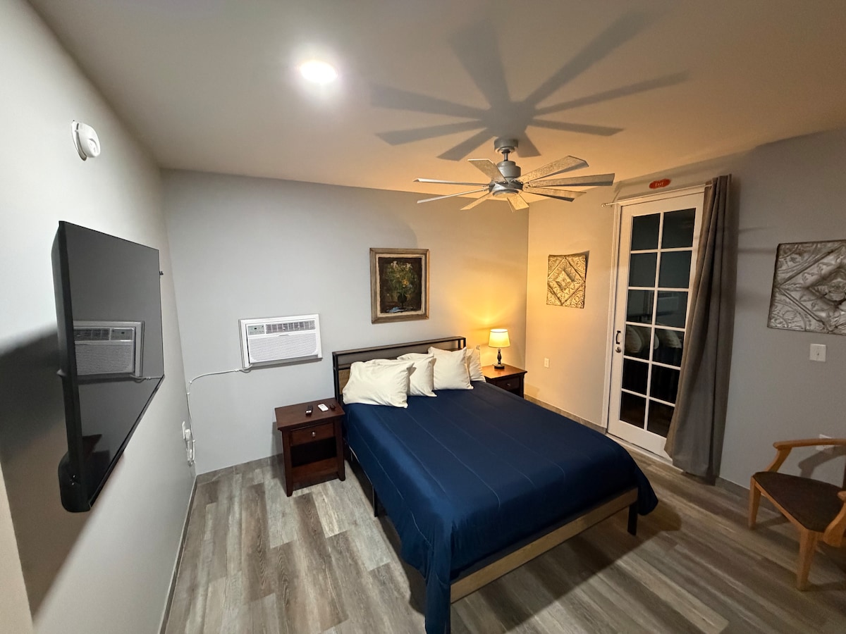 Room 4 on the property. The room is off the common area with access to laundry. The Room has one queen bed. Room amenities include a smart TV, microwave, Keurig coffee maker, water filter and refrigerator. The property has a large courtyard for relaxing. Parking is available on the street or at the adjacent public parking lot. You will be close to all the amenities of the historic district in downtown Hermann.