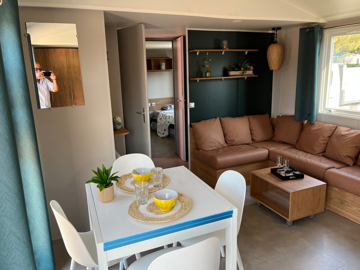 En un camping de 4 estrellas seguro, disfrutará de la tranquilidad de la ubicación, idealmente situado al final de una raqueta en el borde del bosque sin estar demasiado lejos de los lugares de vida, bares, piscina, campos de petanca... La casa móvil puede alojar hasta 8 huéspedes, con una suite principal con una cama para 2 personas equipada con un gran vestidor, dos dormitorios equipados cada uno con dos camas individuales con armario y un sofá cama de 140 en la sala de estar.
