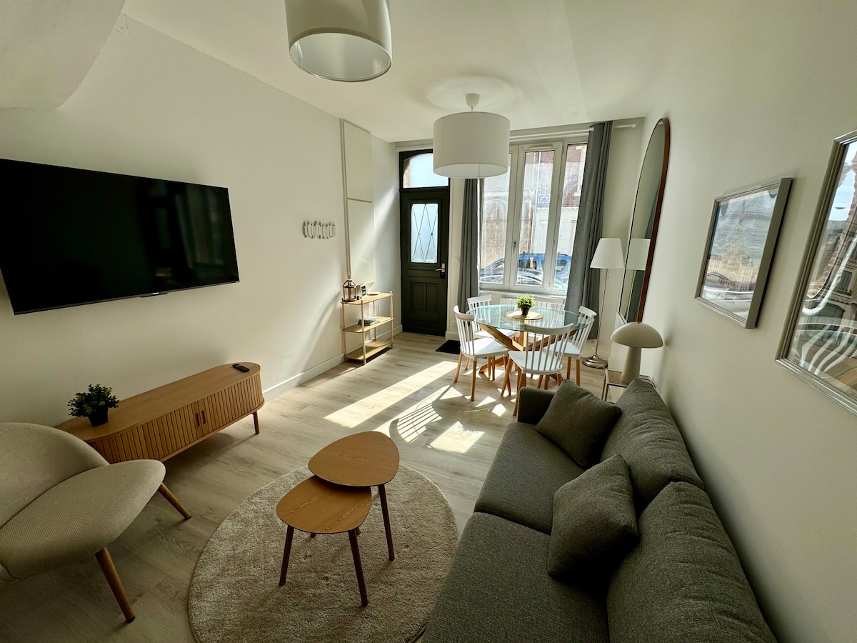 Amplia casa unifamiliar (más de 80 m2) cuidadosamente reformada, ubicada en el centro de la ciudad de Saint-Quentin, cerca de monumentos y tiendas. Dos dormitorios con ropa de cama de alta calidad: uno con una cama de 160x200 y TV, el otro con una cama de 160x200 y dos camas de 80x200. Baño moderno con una gran ducha. TV 4K de 55 pulgadas (Android TV) en la sala de estar. Máquina Nespresso. Wifi de fibra. Netflix y streaming disponibles. Equipamiento para bebés disponible. Anfitriones locales amables y de habla inglesa. Comodidad y conveniencia garantizadas.