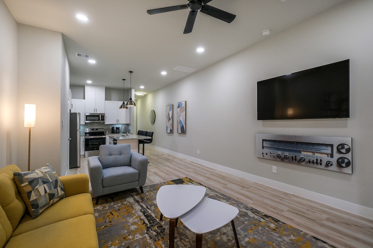 Disfruta del lujo en esta casa adosada de Houston con 3 dormitorios, cada uno con baño privado y TV. La casa inteligente tiene cerraduras automatizadas, luces, aspiradoras y termostatos. El segundo piso es un espacio de concepto abierto con cocina, comedor y sala de estar con TV Samsung de 85 pulgadas, mesa de billar, juegos de mesa y minibar. Hay una pequeña estación de trabajo en el dormitorio de abajo y un espacio de oficina con una configuración de trabajo completa. Disfruta de la zona de estar del patio trasero. Situado a menos de 5 millas del estadio NRG y del parque Minute Maid.