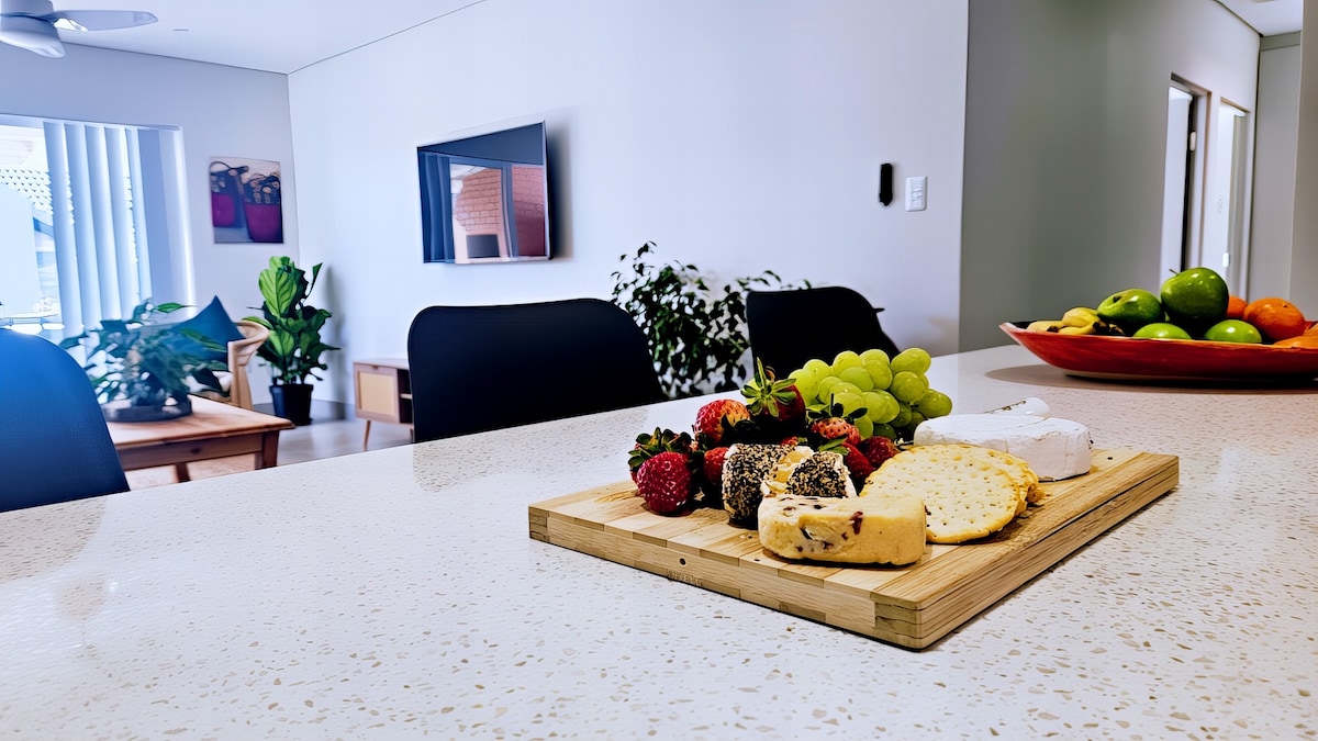 Soak in the mountains and ocean from every room. This modern spacious home has beautiful finishes, an indoor fire place, large patio, garden, Zipline, boma (outdoor fire pit) and kids swings to create the perfect holiday feel for a fun family experience! Below the house is an open plan cottage with a private entrance sleeping x4 sharing. The Cottage ‘Bedroom 3’ has a queen, 2 single beds, kitchen, lounge, patio, bath & shower. Opened upon request. Uncapped WiFi. 15min walk to Santos beach