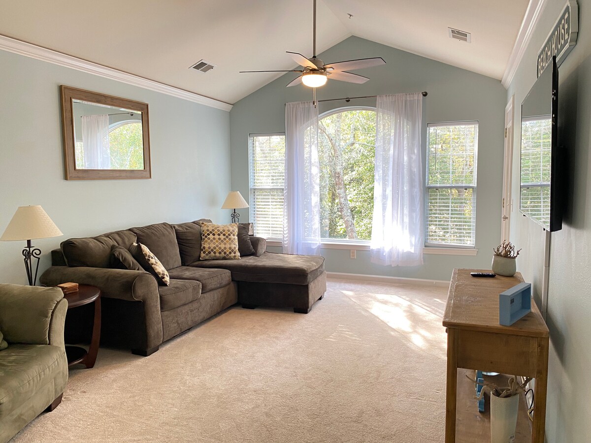 Ven a disfrutar del campo de golf recién renovado. Este condominio del segundo piso ofrece un ambiente relajado que está a poca distancia a pie de golf, pub, piscina y a poca distancia en auto de la playa. El condominio tiene capacidad para 6 personas (1 King, 2 completas y un sofá cama queen). Relájate en el porche delantero de uno de los balancines o disfruta escuchando la lluvia en el porche trasero protegido. * No se permiten motocicletas en la propiedad.