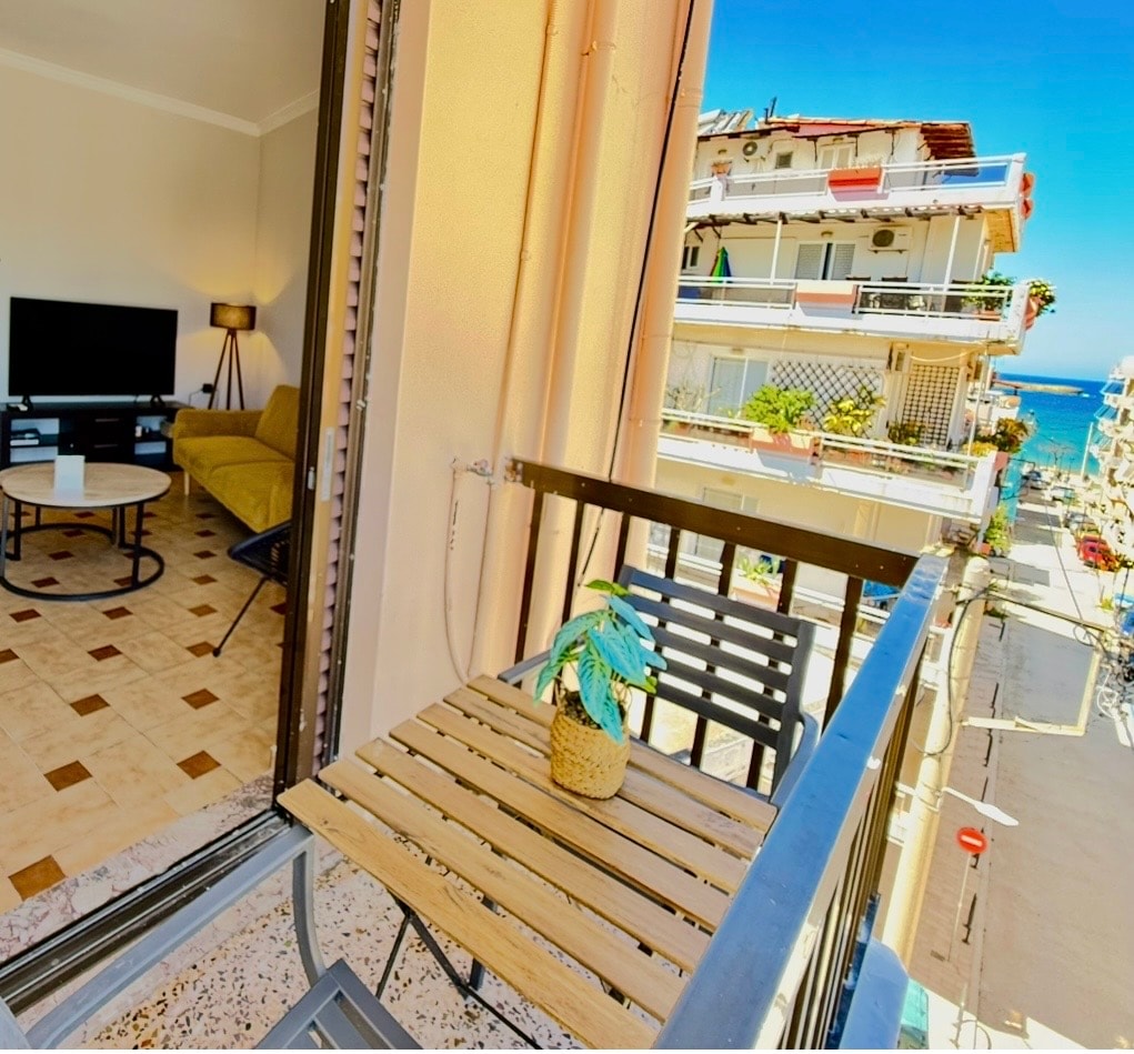 Apartamento frente a la playa de 71 m2 con un balcón de 20 m2. Dos dormitorios, ambos frente a la playa. Situado en la ciudad (rodeado de supermercados, restaurantes, tiendas, etc.) en medio de una carretera costera de 2900 m, ideal para paseos a pie y en bicicleta. Todo lo que puedas necesitar (bancos, parques infantiles, hospital general, etc.) está en un radio de 1.500 m. Ideal para familias con niños. El auto no es necesario, a menos que quieras utilizar el apartamento como base para explorar Creta.