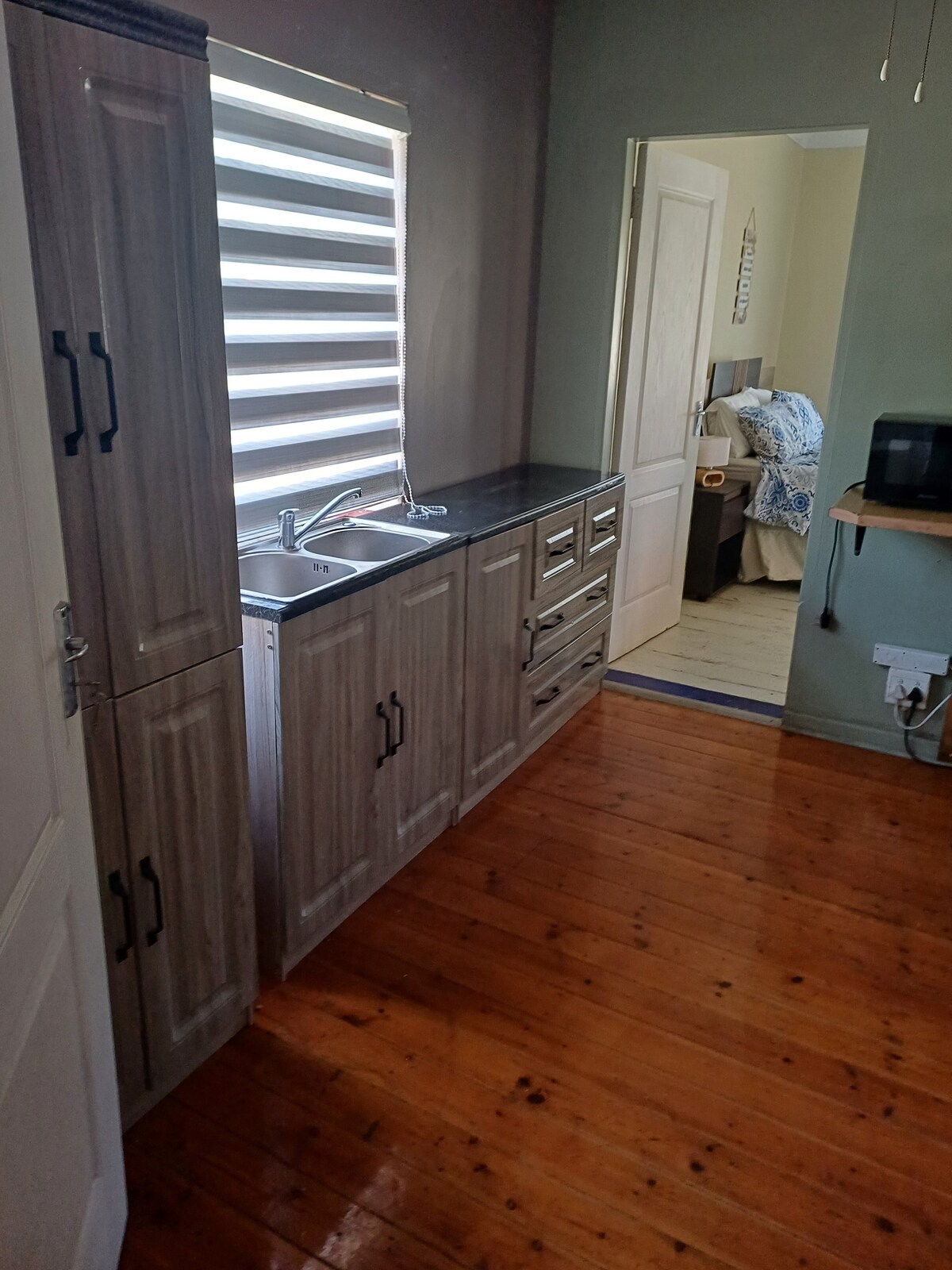 Una suite independiente con cocina situada en una zona con vigilancia las 24 horas, los 7 días de la semana, con tu propia entrada privada. Adecuado para 2 adultos + 1 niño en un colchón en el suelo. Amplia habitación en la planta baja con baño completo en suite. Cama tamaño king, cocina americana equipada. A 15-20 minutos del aeropuerto de ORTambo. Durante el desprendimiento de carga: inversor limitado/batería de respaldo que te proporciona luces, DSTV y wifi gratuito. Aparcamiento en la calle. Uso del jardín y la piscina. Un ambiente relajado y agradable, adecuado para viajes de negocios o de placer.