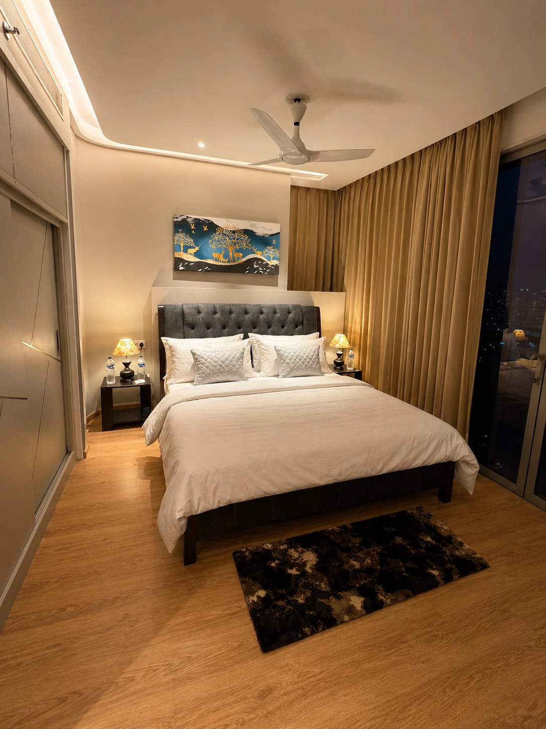 Welcome to Aurelia Luxe, your serene escape on Golf Course Extension Road, Gurgaon. Warm tones, soft textures, and a private balcony create a soothing retreat, designed for families, solo travelers, and couples seeking the perfect blend of comfort and elegance. Guests also enjoy access to building amenities including a swimming pool and gym Indulge in nearby dining spots, and enjoy the convenience of hassle-free connectivity via the Sector 55-56 Gurgaon rapid metro and Huda City Centre metro