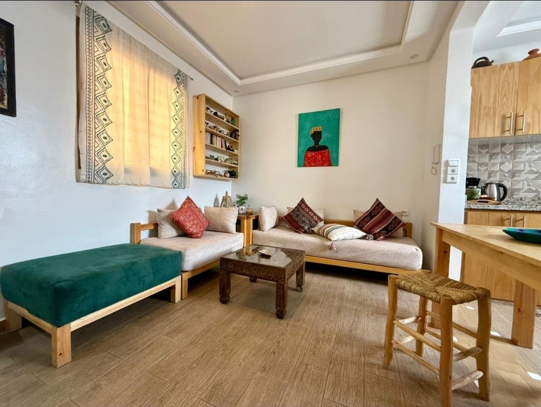 Apartamento de lujo en edificio a estrenar en la 1ª planta totalmente amueblado y decorado en un moderno estilo marroquí. En la cuarta planta hay una terraza común panorámica. Sábanas y toallas de alta calidad. Cocina totalmente equipada con fogones de gas y horno. Lavadora. Estamos a 50 metros del mar, a 500 metros de la medina y a 10 minutos a pie de la estación de kyte. Limpieza diaria, disponible bajo petición. Tenemos internet rápido ilimitado. TV de 32 pulgadas en la sala de estar.