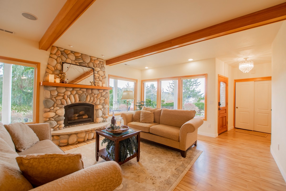 La vida es fácil en Eagle's Nest, a 1,5 millas de la bahía de Gig Harbor. Rodeado de vistas a los árboles y al valle desde las 24 grandes ventanas en 4 lados. El segundo piso de 1200 pies cuadrados es todo tuyo para relajarte. La enorme cocina totalmente equipada te deleitará y nutrirá. ¡Los techos abovedados ayudarán a que tu espíritu se eleve! Disfruta de la chimenea eléctrica, pantalla plana de 75 pulgadas y sofá reclinable. ¡Disfruta de la bañera para 2 o la ducha para 2! Relájate en la terraza amueblada. Disfruta de la sensación del campo mientras estás cerca de las tiendas y del acceso a la autopista.