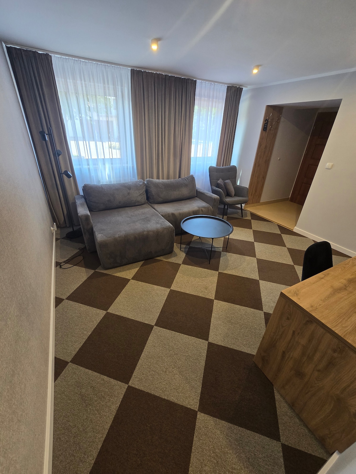 1-BR Apartment fully equipped with: - A fully fitted kitchen - 50" Smart TV and 32" in bedroom - A/C - King-size bed and a sofa bed - Two bathrooms Additionally: - Private parking space - Wi-Fi - Cozy terrace Our guests also have access to a large garden with a fireplace and barbecue area, as well as a volleyball and soccer field. Excellent location: - 250m from the beach - 2km to the Powidz Military Base Discounts for long-term stays and free cleaning included.