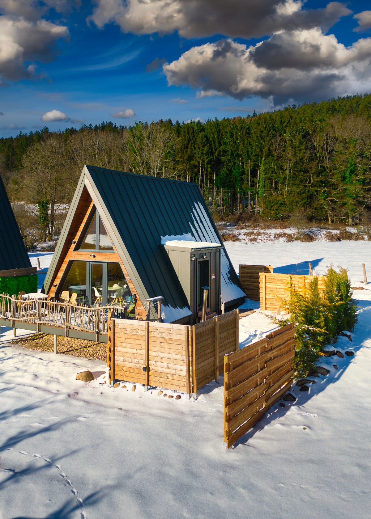 Discover the Atypiques Chalets en A. Ideal for 4 people, located in a quiet village 10 km from Gérardmer. Chalet IORIK aframe, 2 comfortable bedrooms, fully equipped kitchen, large terrace and magnificent Nordic bath with balneotherapy just for you. - ORIGINAL ARCHITECTURE and very HEAVENY - Large suspended TERRACE with Jacuzzi access - Large IGLOO SAUNA for sharing or private use - Just a stone's throw from GÉRARDMER and the SKI SLOPES - Close to ALSACE CHRISTMAS MARKETS