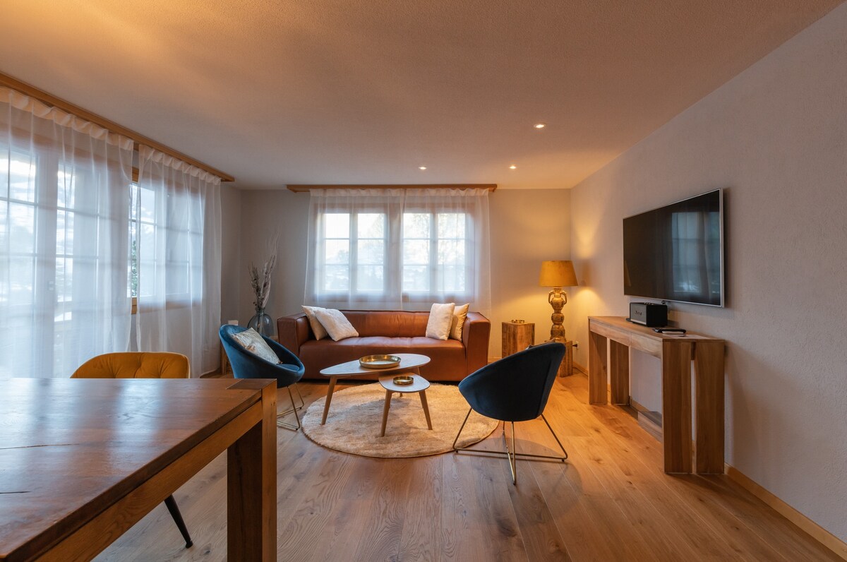 Maravilloso apartamento moderno (totalmente equipado, dos pantallas planas de TV, WiFi, TV vía satélite) con jardín, perfectamente situado junto al tren a Jungfraujoch y EN el dominio de esquí/senderismo. ¡Disfruta del aire fresco y del hermoso paisaje montañoso con el máximo confort!