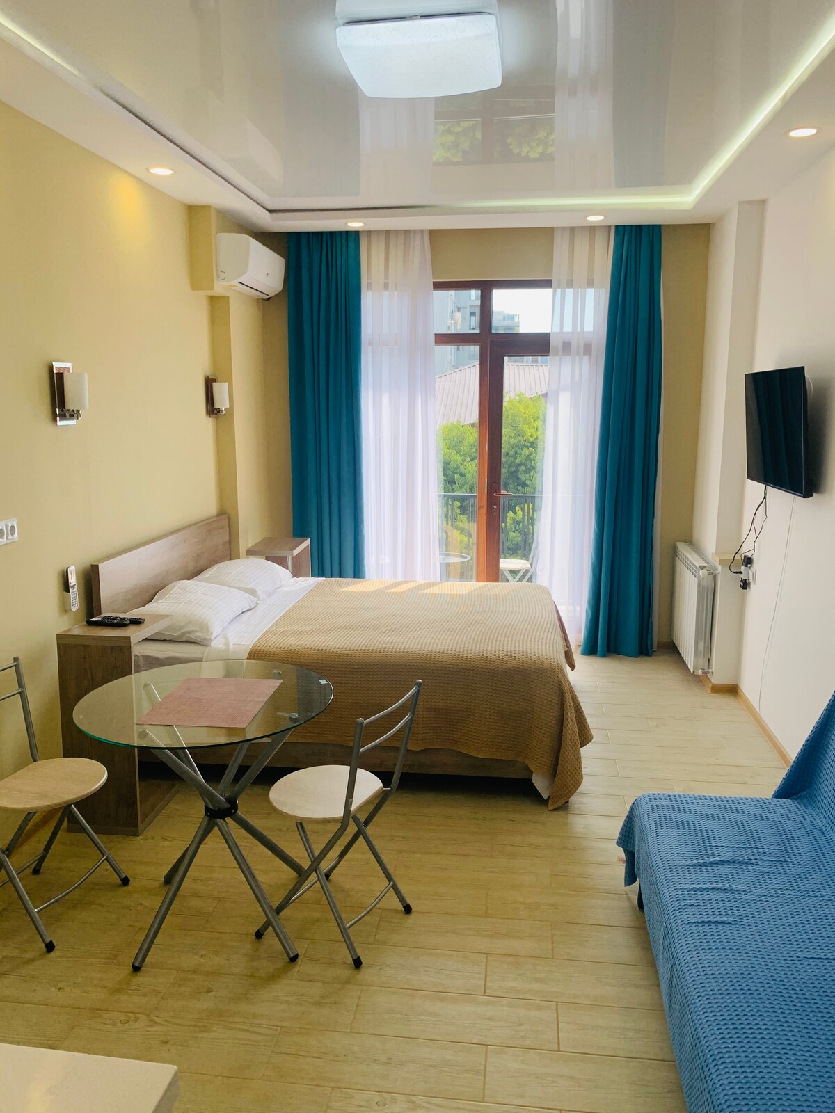 ¡Cómodo estudio con vistas al mar en el corazón de Batumi! ¡Ascensores rápidos y modernos! ¡Limpio, sin moho ni olores extraños! ¡Aislamiento acústico! No hay clubes ruidosos ni obras de construcción cerca. Ubicación: A pocos pasos de las magníficas fuentes y del terraplén, donde se puede disfrutar de paseos por la playa. Infraestructura: cerca del apartamento hay un centro comercial, restaurantes con exquisita cocina georgiana y europea, así como tiendas abiertas las 24 horas. ¡Te esperamos en Batumi!