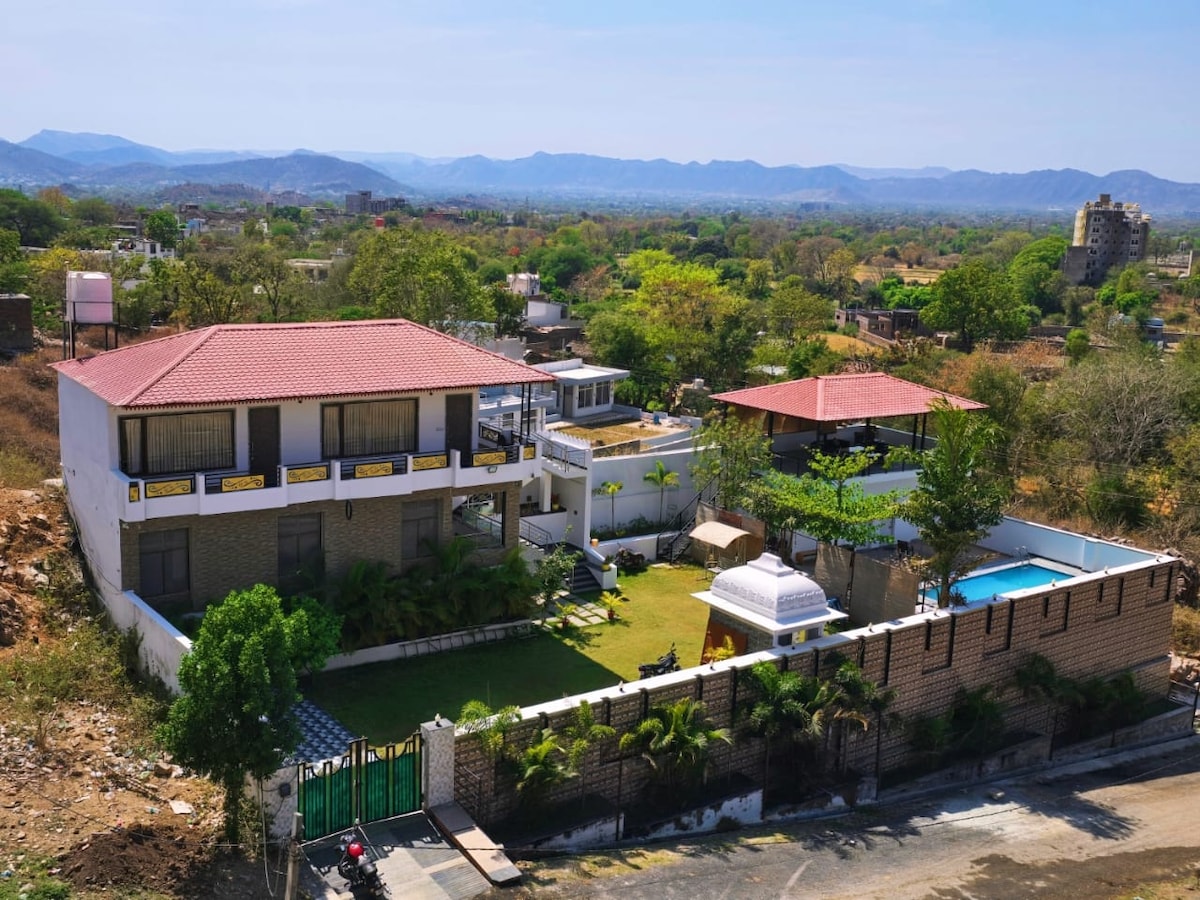Kesarbagh Udaipur: lujoso retiro con piscina privada de 3 dormitorios en la naturaleza | Badi, Udaipur Piscina privada con vistas impresionantes, perfecta para un relajante chapuzón en cualquier momento Amplia villa 3BHK con interiores elegantes y comodidades modernas Entorno natural tranquilo, ideal para una escapada tranquila Hermosa zona de estar al aire libre A pocos minutos del lago Badi, senderos naturales y las mejores atracciones de Udaipur Tu paraíso privado en el corazón de la naturaleza te espera.