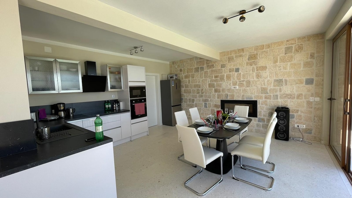 Wonderful luxury stone house with the sea view. Sleeps 6 (1 master bedroom with terraces, 1 semi-open bedroom with bridge). Features a spacious bathroom, dining, living, 2 modern kitchens, patio with shade, 2 covered terraces, and fireplace. Access to property camp facilities & nature spots like Zrmanja Canyon (11km) & "Kanyon of River Bijela" (200m). Enjoy windsurfing, kayaking, climbing.