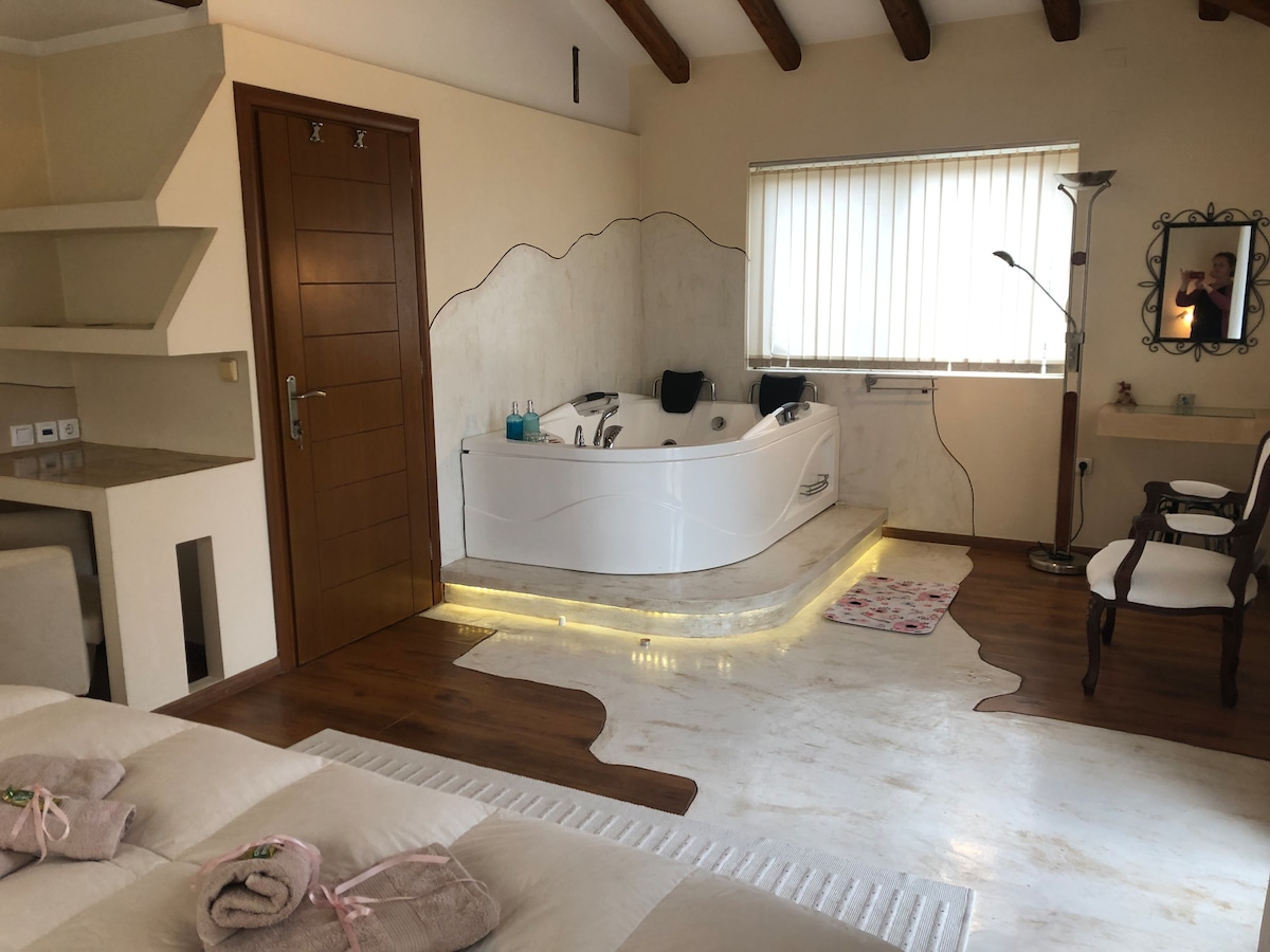 El apartamento está en el segundo piso de una casa independiente que incluye una sala de estar con chimenea y un minibar,una cocina totalmente equipada,un baño y un dormitorio grande con un jacuzzi en el interior. ¡Ideal para parejas! También hay un gran balcón con una vista fantástica de la ciudad de Corfú y los suburbios. La distancia desde la ciudad de Corfú es de unos 2 km , del puerto a 3 km y a 2 km del aeropuerto. La estación de autobuses está a 5 minutos a pie . Alquiler de coches y bicicletas a buenos precios ,sin cargos adicionales. Netflix en la televisión