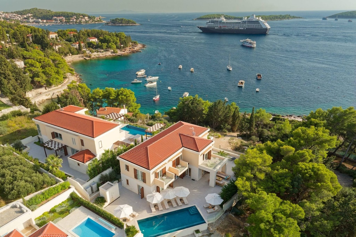 Cerca del centro de Hvar, con piscina infinity climatizada, jacuzzi y vistas panorámicas al Adriático y a las islas Pakleni - ideal para días elegantes y soleados en Hvar.