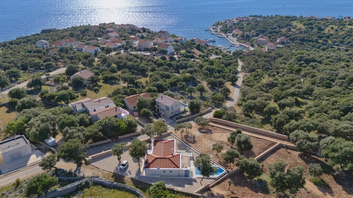 Amazing sea view brand new villa with big heated pool, BBQ area, direct sea access - its suitable up to 10 persons with 18000 square meters wood around and no any direct neighbours, 350 m from sea, near Gozinka beach, Suha Punta . Villa is fully equipped, divided in 2 parts in total with 4 double bedrooms & all en suit bathrooms, 2 kitchens, 2 living rooms, 2 laundry rooms, wifi, air con, parking places & floor heating. Suha Punta is one of the nicest areas on Rab, with plenty of beautiful bays