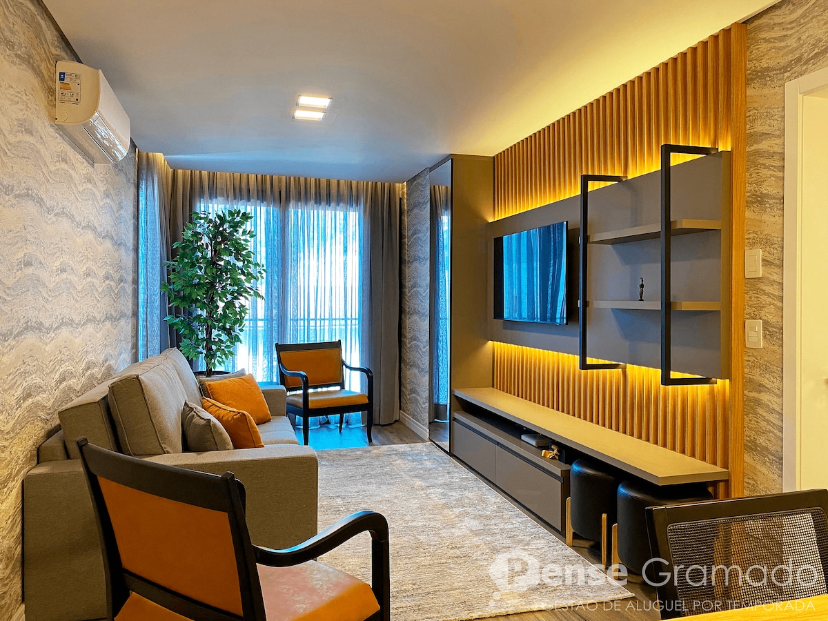 ¡Este increíble apartamento de alta gama ha sido completamente rediseñado! ¡Ofrece 180m2 y elegancia en cada detalle, grandes ventanales con vistas panorámicas exclusivas al valle de Quilombo, 70"Smart TV en la sala de estar y 43" en dos dormitorios! Además, ¡está a solo 2 manzanas de la calle Coberta! Debido a que se encuentra en el centro, podrás hacer muchas cosas a pie, ¡tendrás la comodidad de dejar el auto y contemplar con paz y tranquilidad todo lo que Gramado tiene para ofrecer!