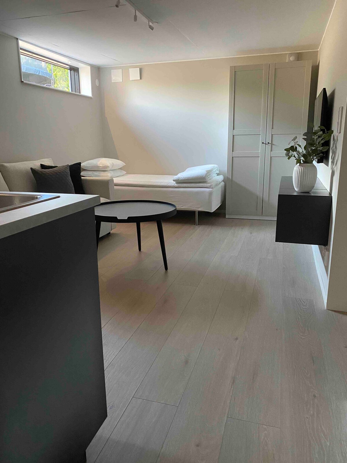 Apartamento recién renovado y fresco en todo momento, de alto nivel, en una zona tranquila y agradable. El apartamento tiene dos dormitorios separados con 2 camas de 90 cm que se pueden separar. Cada dormitorio y la sala de estar tienen su propio televisor con una amplia gama de canales y servicio de transmisión de películas. La cocina está equipada con nevera, microondas, placa de inducción, horno, lavavajillas y cafetera. Lavadora/secadora combinada en el baño. Aparcamiento gratuito con posibilidad de comprar la carga de un coche eléctrico. Cerca de varias paradas de autobús.