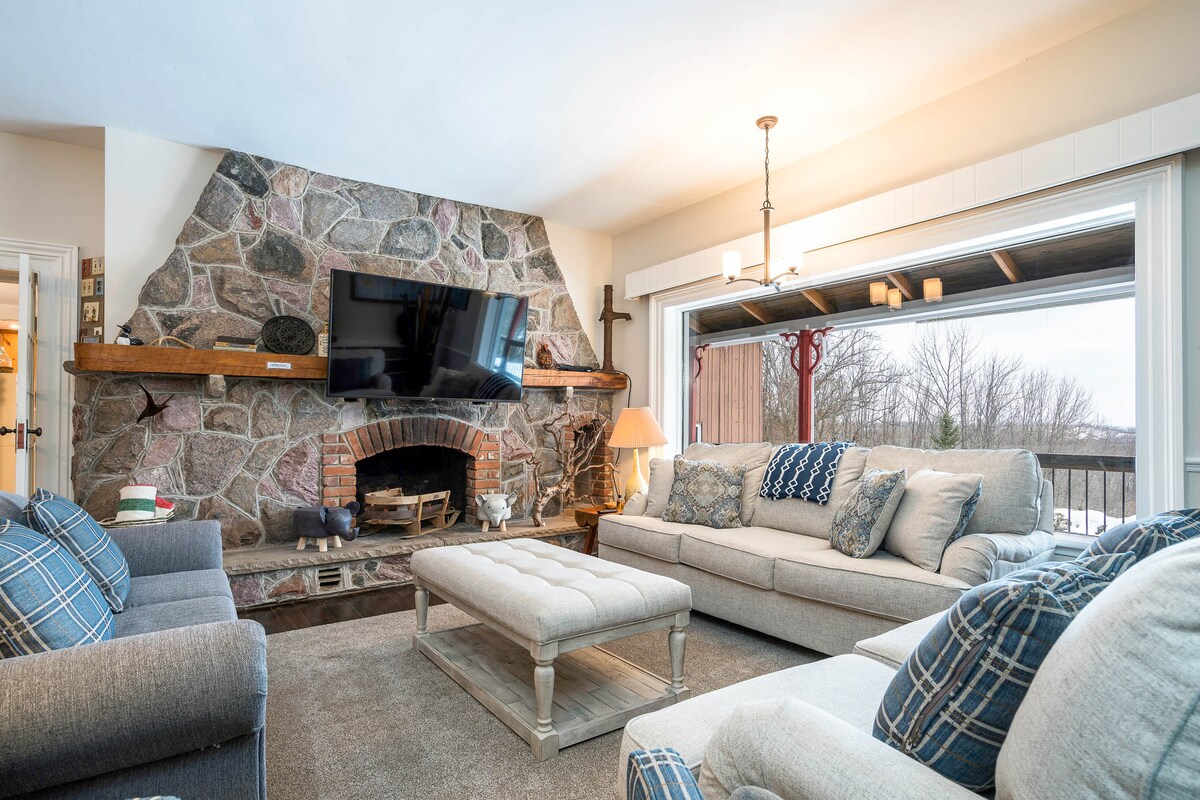 ¡ESQUIA DENTRO Y FUERA desde la terraza trasera (dependiendo de la nieve)! Observa la cantidad de asientos cómodos para NUEVE PERSONAS alrededor del televisor que muchos otros lugares no tienen. Al final de un largo día de esquí, tener un lugar cómodo para que todos se sienten es lo que les falta a la mayoría de los chalets. Disfruta del hermoso chalet de nuestra familia, renovado, en la PLANTA BAJA con 2 dormitorios, 2 baños y 6 camas, convenientemente ubicado junto al Blue Mountain Inn. Blue Mountain Village está a 7 minutos a pie. Ubicación, ubicación, ubicación.