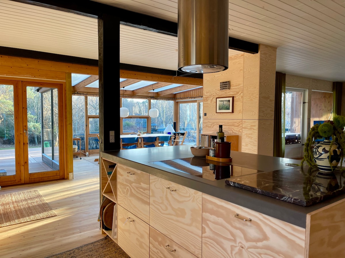 Encantadora casa de campo nórdica moderna en una carretera privada con una terraza soleada, parrilla y zona de fogatas. Dos dormitorios (4 personas), cocina totalmente equipada, TV inteligente y baño renovado. Anexo con sofá cama e inodoro (solo para uso en verano). Se proporcionan sábanas, toallas y artículos básicos. A 200 metros de una hermosa playa. Cafés, restaurantes y supermercados cercanos. Cerca de las ciudades de Hornbæk y Gilleleje para ir de compras y cenar. Junto al Museo Tegner para experiencias culturales únicas que combinan arte y naturaleza.