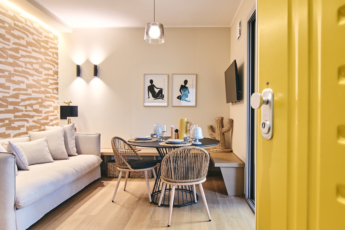 Apartamento de lujo situado a solo 30 metros de la playa, recomendado para una ocupación ideal de 2 adultos y 2 niños para garantizar el máximo confort durante su estancia. El alojamiento cuenta con: - Terraza con vistas al mar, amueblada con sala de estar y mesa de comedor. - Dormitorio doble con baño privado, salón con sofá cama (no hay persianas en el salón). - 2 televisores inteligentes, wifi y aire acondicionado en todas las habitaciones, cafetera; - 1 plaza de aparcamiento.