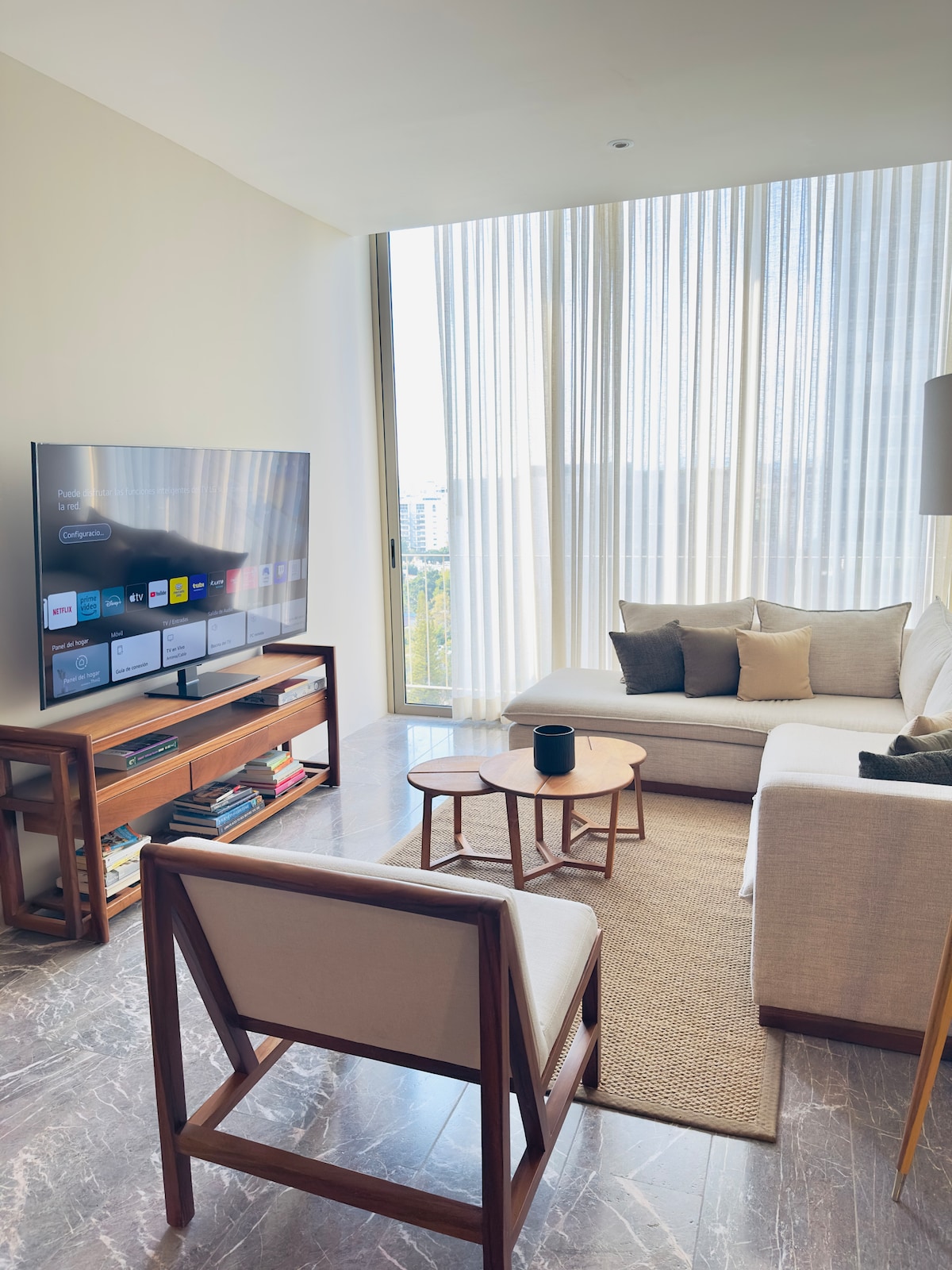 Ubicado en la zona financiera y cerca del Consulado Americano, este espacio en el piso 11 combina confort y limpieza. Con excelente ventilación e iluminación ajustable gracias a persianas blackout, cada detalle está pensado para tu comodidad, con equipamiento de alta calidad. El edificio ofrece gimnasio, terraza con vista panorámica, áreas recreativas y cine al aire libre. Incluye estacionamiento propio, lava-secadora y amenidades básicas para tu llegada. Ideal para viajes de trabajo o descanso.