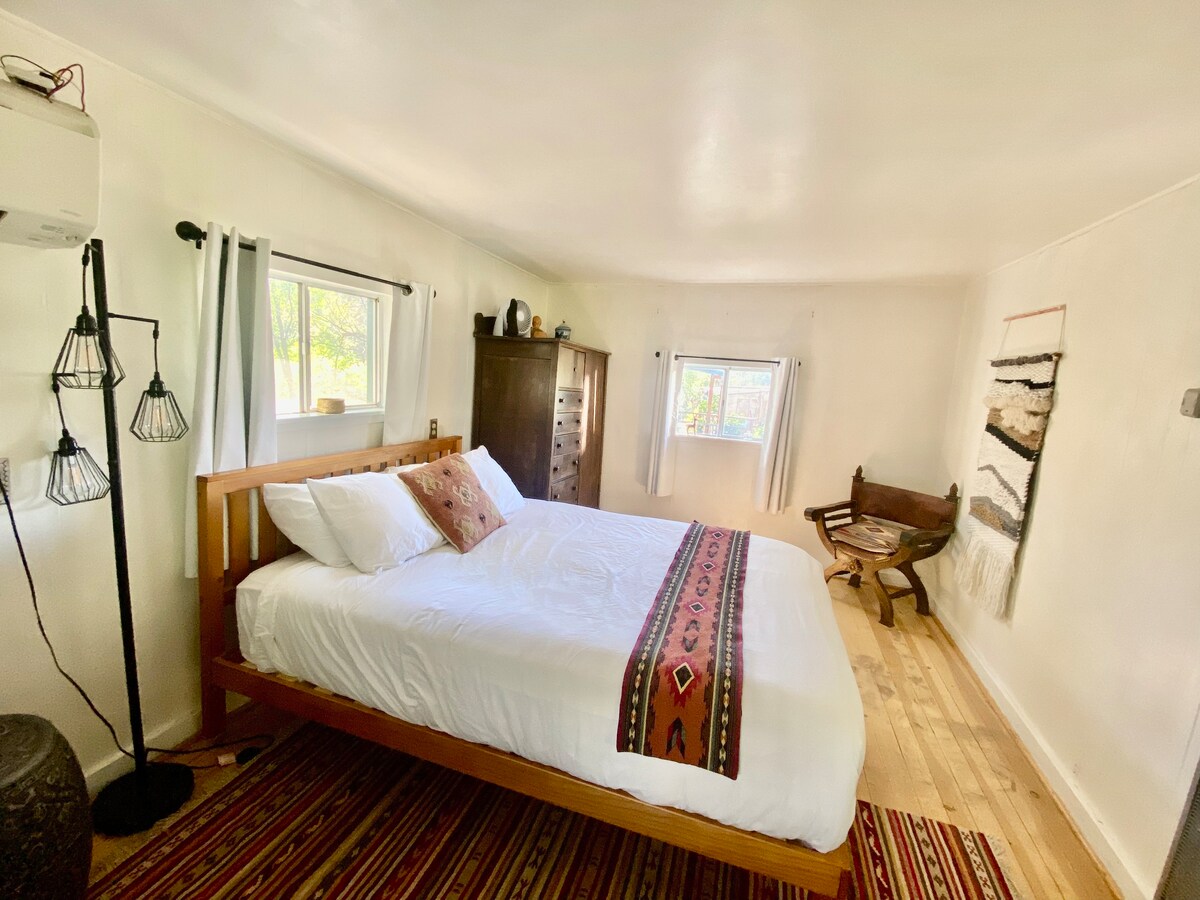 Disfruta de este hermoso estudio. Relaja tu mente y tu cuerpo en una hermosa sauna de cedro. Sal por la puerta para dar un paseo al atardecer con impresionantes vistas a la montaña. Dulce patio lleno de árboles frutales. Entrada privada y mucho aparcamiento. Fácil acceso al norte o al sur: a 15 minutos de la plaza del centro de la ciudad o conduce hacia el norte por la autopista 64 para llegar al puente Gorge o a Ski Valley. Construido por mujeres artesanas, este es un hogar especial lejos de casa. ¡Somos Superanfitriones experimentados y estamos aquí para ayudarte con tu viaje!