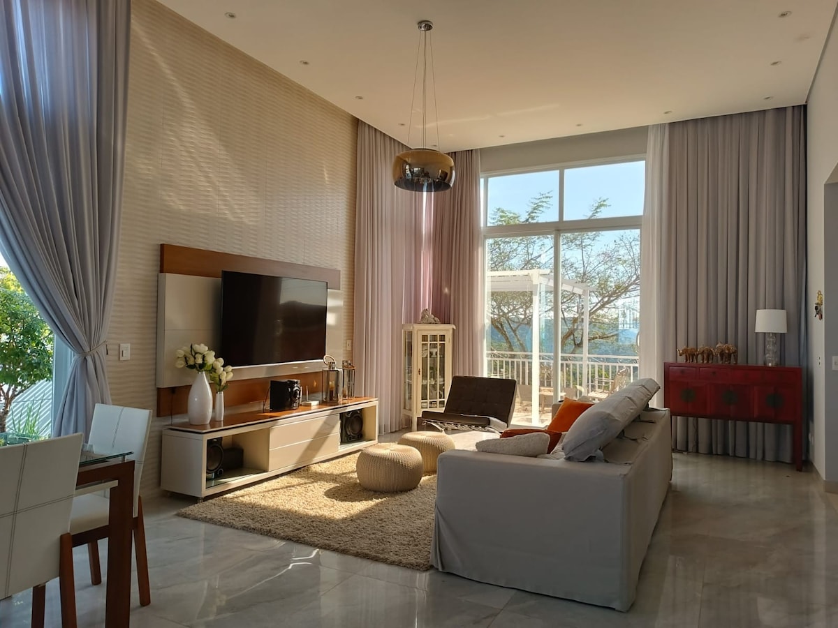 A 23 KM de SP, Casa Relax es ideal para reuniones familiares y de amigos. Ideal para la planificación estratégica de su equipo. Naturaleza, barbacoa y piscina climatizada, diversión garantizada incluso en días fríos y nublados. Late Checkout 18h. Ropa de cama/baño, cuna, baño con amenities, cocina equipada - lavavajillas. Aceptamos mascotas. Condominio de alto estándar, 5 suites, jardín, chimenea, espacio de trabajo, amplia sala de TV e internet rápido, en una casa de 400 m. Tenemos energía solar.
