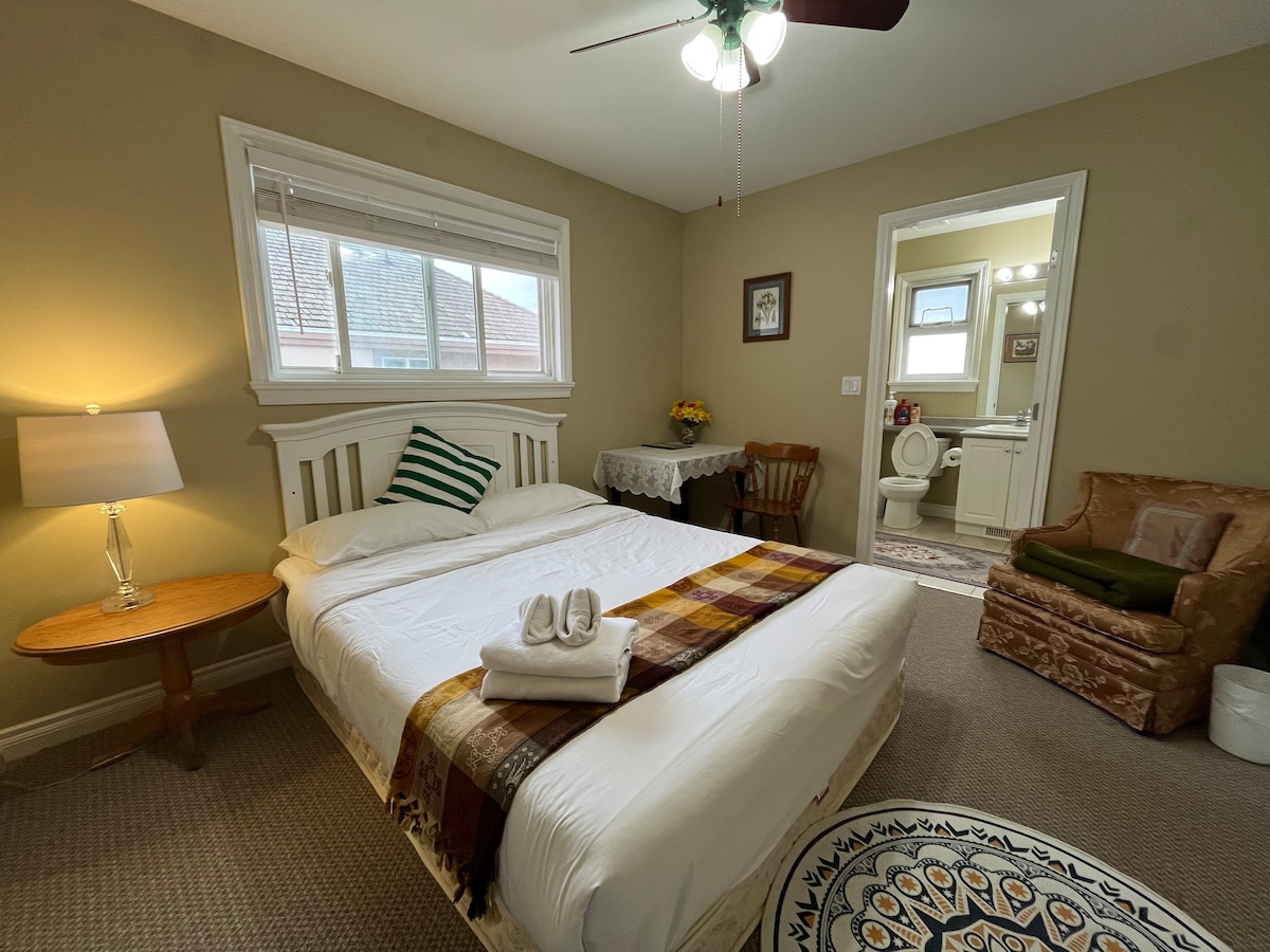 This is a bedroom with a private bathroom. It's South-facing, cozy & bright, in a quiet neighborhood. It is just 15 minutes on foot to Surrey Central Mall and King George skytrain Station. Downtown New Westminster is a 12-minute drive away. Bus routes **323 & 324** service our area. Easy connections to Downtown Vancouver in about 40 minutes. Welcome to your cozy retreat! We’re delighted to host you and hope you enjoy a comfortable, memorable stay. ❤️