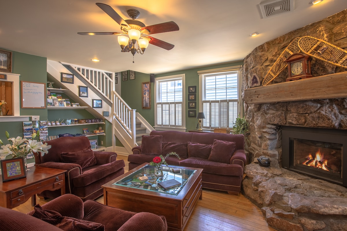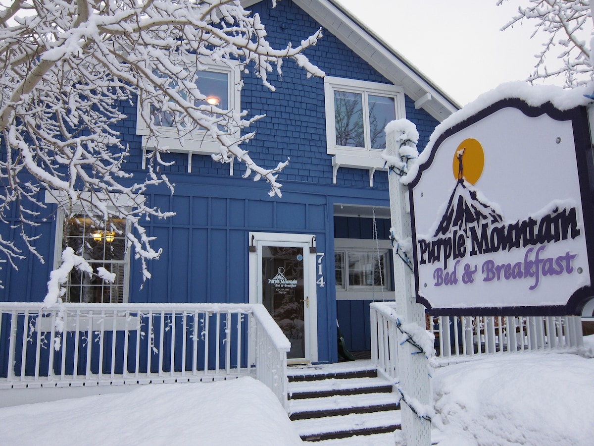 Esta acogedora habitación ofrece una cama tamaño queen y un baño privado con bañera y ducha. The Purple Mountain es un B&B tradicional de 6 dormitorios que ofrece una rotación de desayunos gourmet todas las mañanas y una degustación de cerveza artesanal de Colorado cada noche (lunes-sat), incluida con la habitación. La propiedad también ofrece una bañera de hidromasaje al aire libre, ducha de vapor, un spa de un día que ofrece una variedad de masajes, una sala de yoga, almacenamiento de esquí junto a la pista y un servicio gratuito de traslado de la ciudad de 5 minutos a la estación de esquí a solo una cuadra de distancia. La ciudad es transitable.