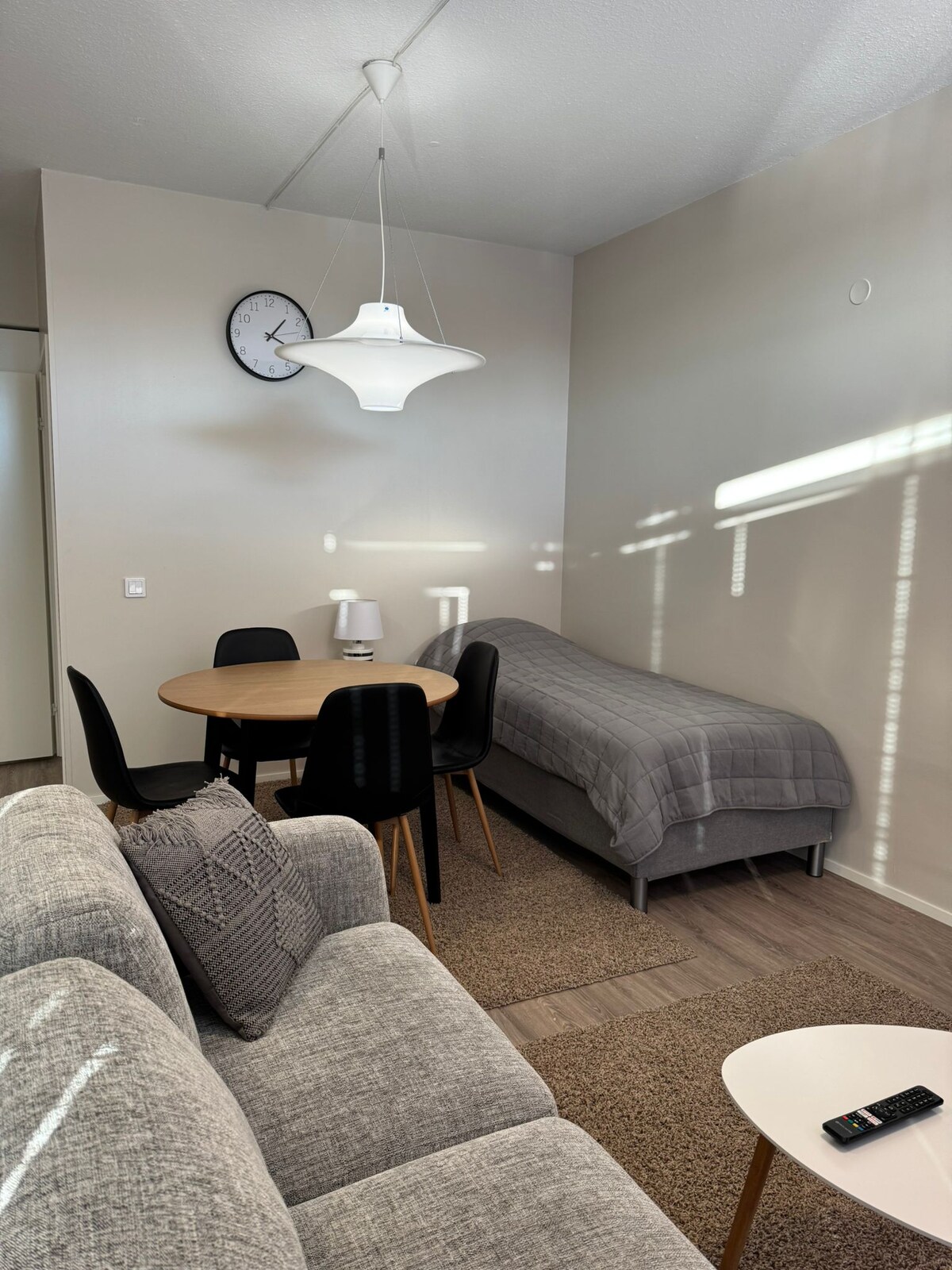 Bienvenido a alojarse en un estudio luminoso y espacioso en una zona tranquila de Haapajärvi. El apartamento ha sido completamente renovado recientemente, combinando comodidades modernas y un ambiente acogedor. Las instalaciones son perfectas tanto para viajeros de negocios como para turistas. El dormitorio tiene mucho espacio de almacenamiento y el salón tiene una cómoda zona de estar. La cocina está totalmente equipada y el baño está limpio y es moderno. Aparcamiento grande gratuito en el patio del apartamento.