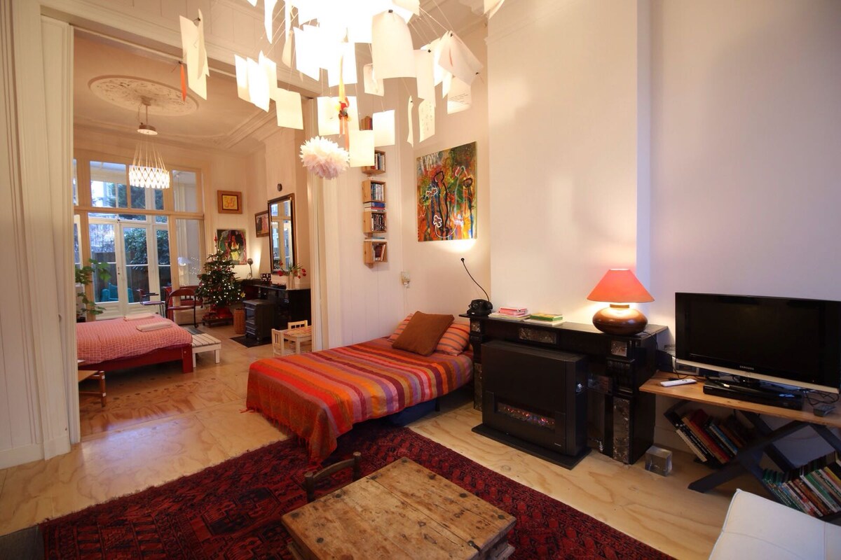 Amplio, luminoso y espacioso apartamento en el piso con despensa y pequeño baño en nuestra mansión clásica construida en 1897 en la hermosa Haarlem. Muy céntrico. ¡Cerca del centro antiguo y la estación de tren! Cerca del Parque Nacional, las playas y Ámsterdam. Sala de estar con una pequeña cama doble y 2 sofás cama y una gran cruz, puertas correderas al dormitorio principal con una cama king size y entrada al baño. Puertas corredizas de vidrio para una despensa con mesa de comedor, nevera, horno/microondas y lavavajillas.